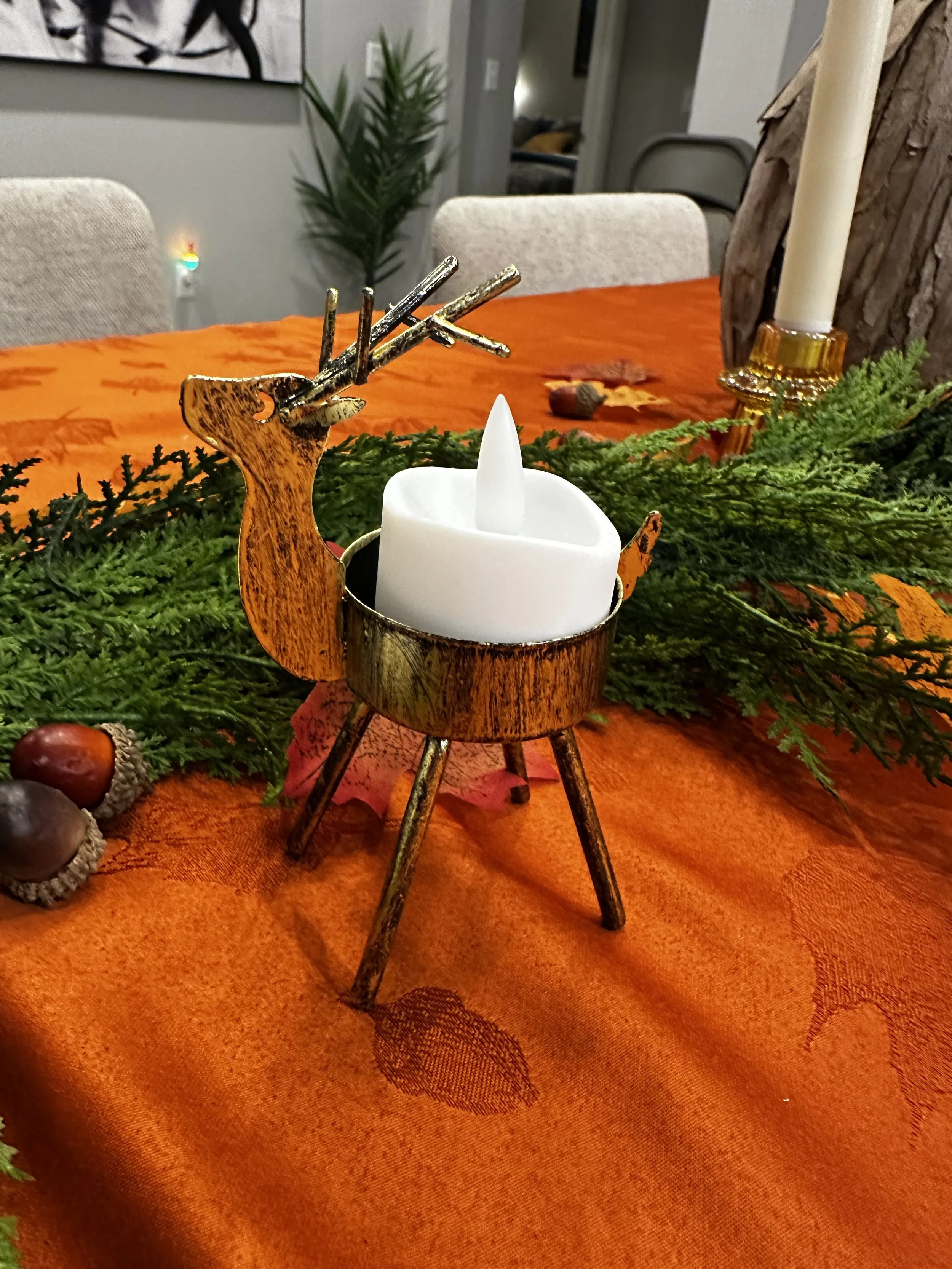 I layered faux greenery, fall leaves, acorns, pumpkins, and candles down the center of the table. I used gold-trimmed plastic plates, goblets, and thick disposable napkins that still felt elevated without creating more cleanup at the end of the night.