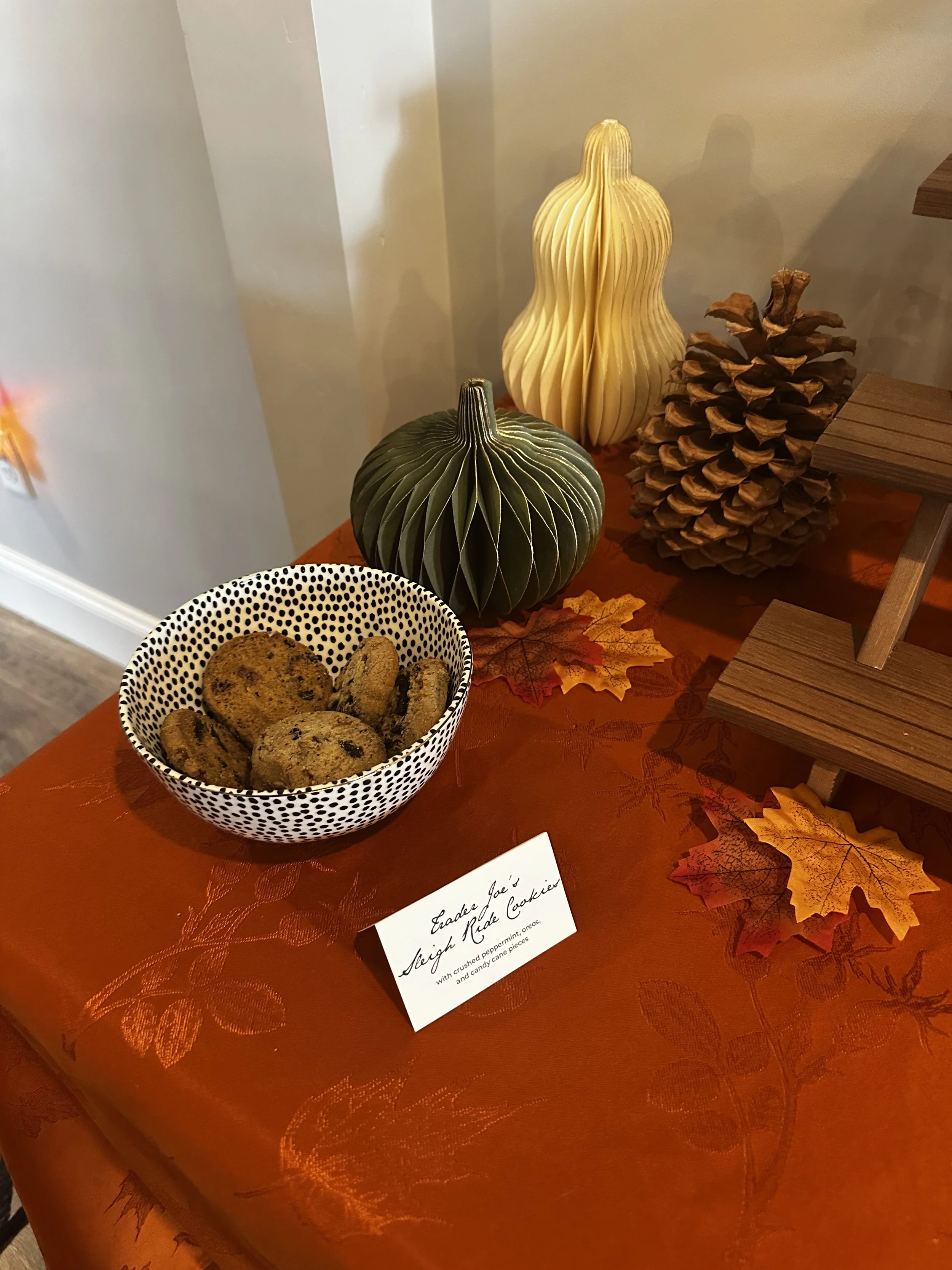 Instead of assigned seating, I set up a small welcome table with a sign inviting guests to find their name and pick their seat. Each name card sat in a little wooden holder that looked like a tiny tree stump to give the feeling of a “cozy woodland forest”. The idea was simple. I wanted people to mingle, snack, and talk without feeling like they needed to claim a chair the second they arrived.