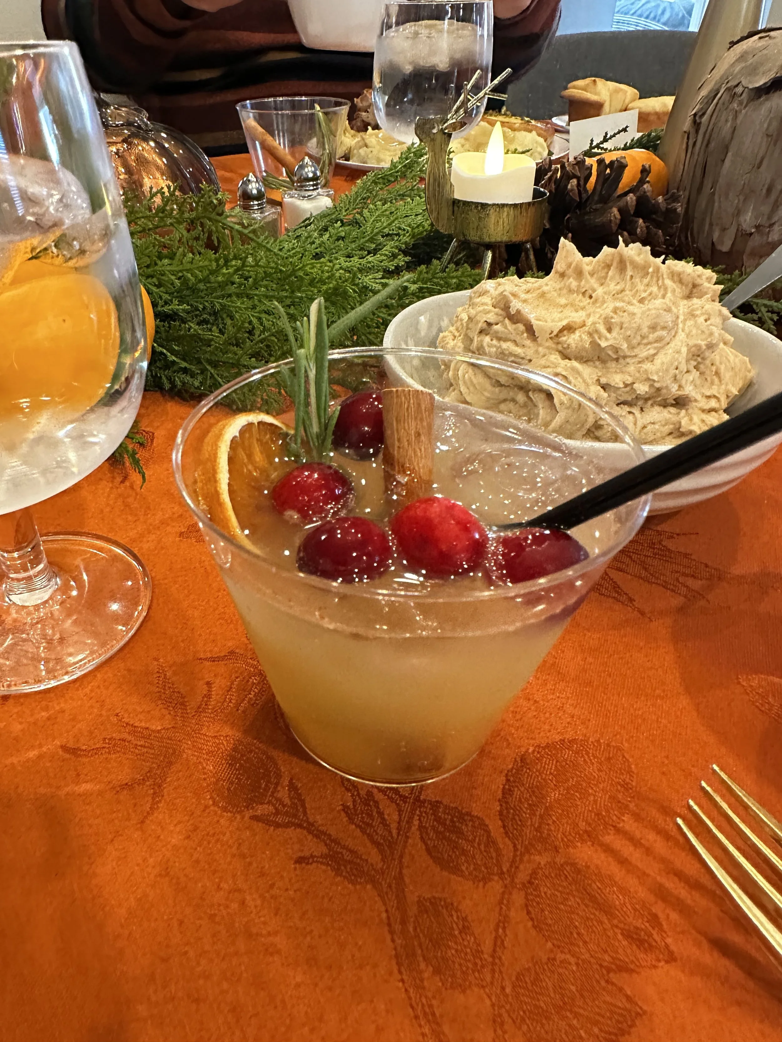 Each place setting included a drink garnish on top of the napkin: a dried orange slice, a sprig of rosemary, and a cinnamon stick, which guests could add to their drinks if they wanted. Nearby, I set up a small drink station with a simple mocktail, a bucket of ice, and a bowl of frozen cranberries for garnish. Using separate glasses for drinks helped keep the table feeling more open and gave everyone something fun to sip while waiting for dinner, even though I completely forgot to photograph the drink station in the whirlwind of the day.